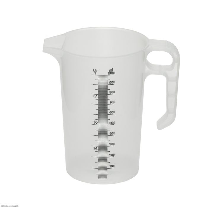 - Graduated markings in litre (showing 1/4, 1/2, 3/4 and 1 litre) and millilitres (displaying 100ml increments, and markings every 10ml)