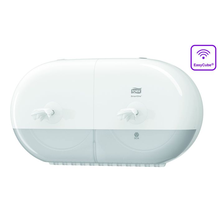 The Tork SmartOne® Twin Mini Toilet Roll Dispenser in Elevation Design is a modern efficient dispensing system suitable for demanding washrooms with high traffic. By holding two rolls and sheet-by-sheet dispensing, consumption is reduced by up to 40 % compared to traditional jumbo roll dispensers which means more visits per roll. Tork Elevation dispensers have a functional, modern design that makes a lasting impression on your guests.