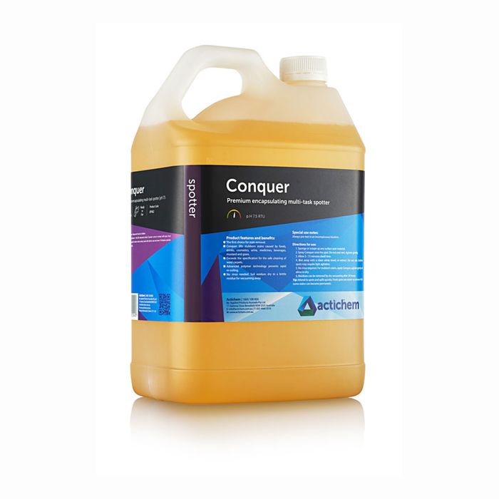 Conquer is an unbeatable multi-task spotting solution effective on a wide range of water-based and oily stains, with the added benefit of anti-resoiling encapsulation technology. The Conquer formulation provides serious stain removal properties for a wide scope of stain types but has a unique focus on fibre care and anti-resoiling functionality.