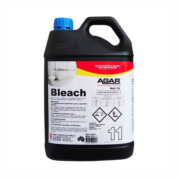 Bleach is a solution of sodium hypochlorite in water with an available chlorine content of 5% when packed.