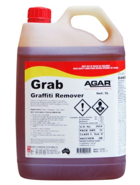 Agar Grab is a very powerful solvent-type paint and ink removal agent. It is water-emulsifiable so it can be rinsed away effectively with water. It is a low odour liquid with outstanding performance and it is a thickened liquid so it will “cling” to vertical surfaces. GRAB will not leave unwanted chemical odours after being used. It is classified as Dangerous Goods.