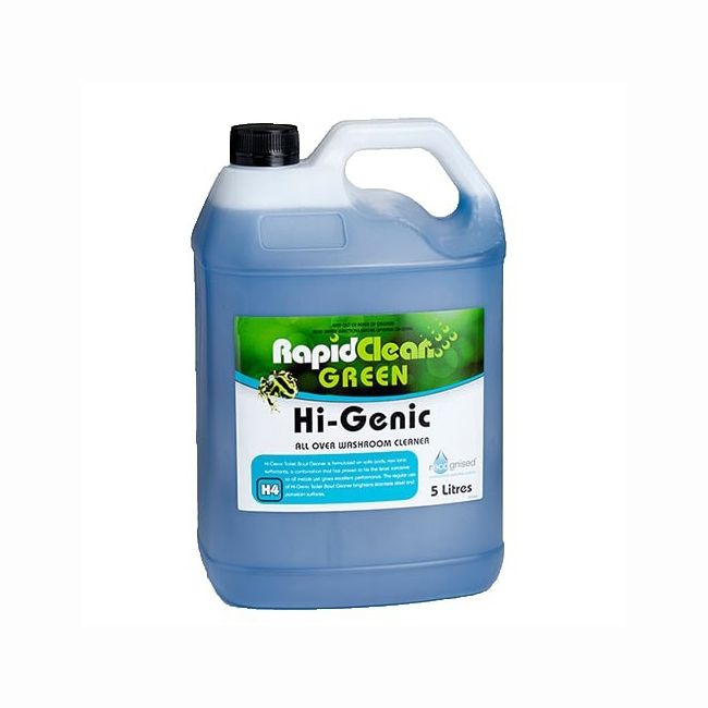 RapidClean Hi-Genic Washroom Cleaner can be used safely on a wide variety of surfaces including stainless steel and porcelain toilet bowls, urinals and stone bench tops. HI-GENIC incorporates a blend of natural organic acids and wetting agents combined with a specially formulated thixotropic agent. The acidic detergency provides rapid penetration and dissolution of limescale deposits, uric acid deposits and stains, whilst the thixotropic characteristics ensure that the thickened liquid has an extended contact time by “sticking” to all vertical surfaces.