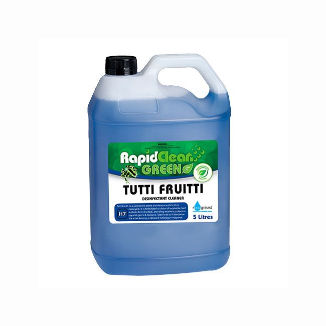 RapidClean Tutti Fruitti Disinfectant is a blue-coloured liquid that contains a combination of cleaning agents and highly effective quaternary sanitisers plus a long-lasting bubble gum residual perfume.