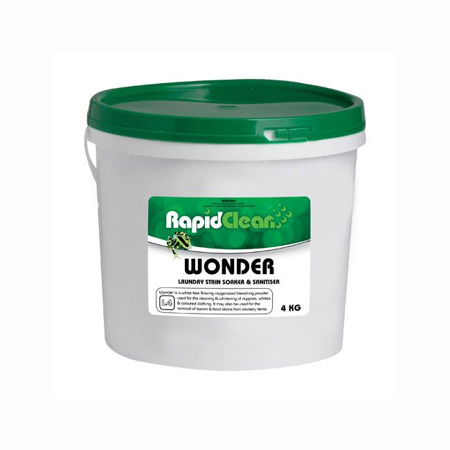 WONDER is a white free-flowing oxygenated bleaching powder used for the cleaning and whitening of nappies, whites and coloured clothing. It may also be used for the removal of tannin and food stains from crockery items