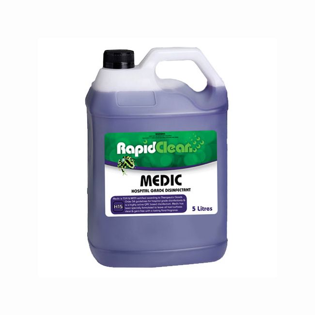 RapidClean Medic Hospital Grade Disinfectant is a clear blue-coloured liquid that contains a combination of cleaning agents and highly effective quaternary sanitizers plus a long-lasting floral fragrance. Medic will reduce the number of pathogenic organisms to such a level that they are no longer able to initiate an infection. Medic meets the NSW Health  Department Standards proposed in the Therapeutic Goods Act.