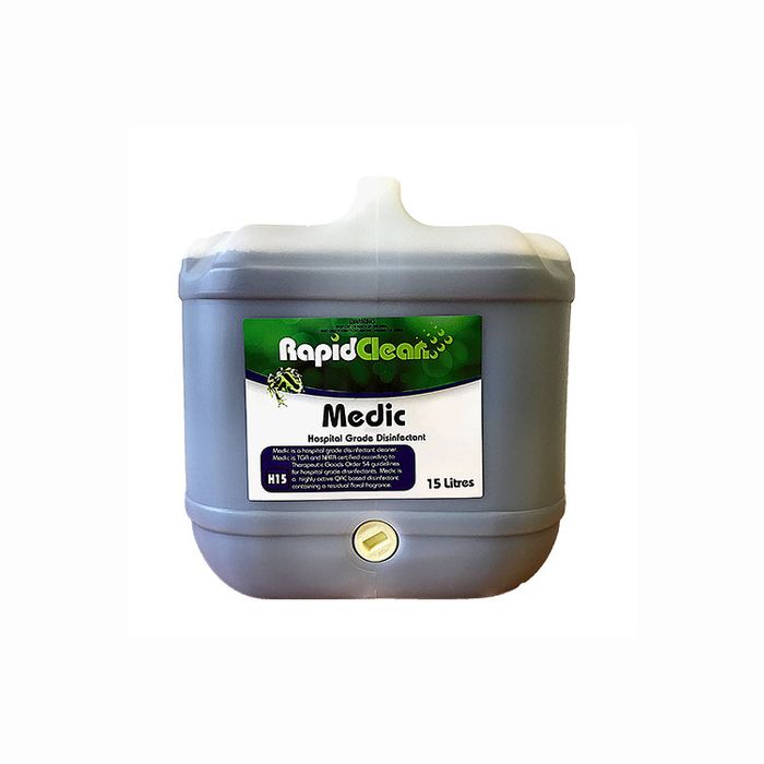 RapidClean Medic Hospital Grade Disinfectant is a clear blue-coloured liquid that contains a combination of cleaning agents and highly effective quaternary sanitizers plus a long-lasting floral fragrance. Medic will reduce the number of pathogenic organisms to such a level that they are no longer able to initiate an infection. Medic meets the NSW Health Department Standards proposed in the Therapeutic Goods Act.