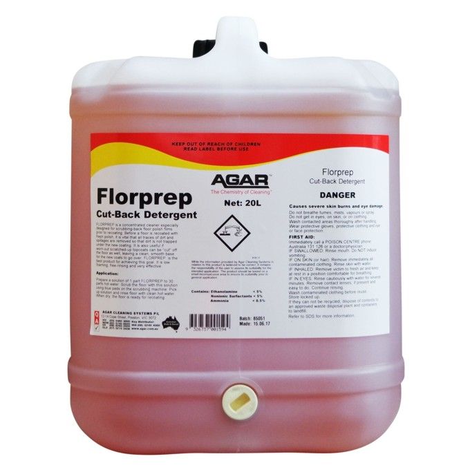 FLORPREP is a concentrated cleaner especially formulated for scrubbing-back floor polish films prior to recoating. Before a floor is recoated with fresh polish, it is vital that all traces of dirt and spillages are removed so that dirt is not trapped under the new coating.