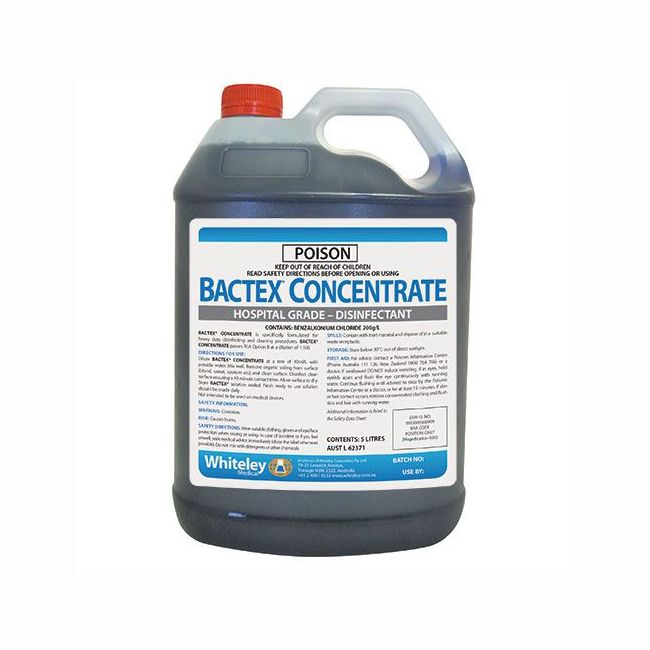 Bactex® Concentrate is a concentrated quaternary-based, pH-neutral hospital-grade disinfectant. It has excellent cleaning and deodorising properties and can be used as a general-purpose cleaner and disinfectant for environmental surfaces. The concentrated surfactant system in Bactex® Concentrate makes it an excellent hard surface cleaner.