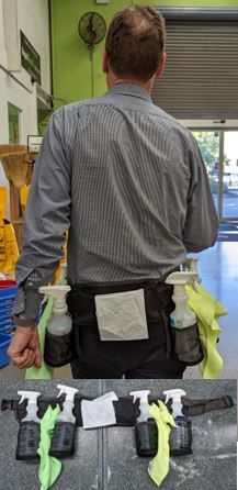 A cleaners tool belt designed for convenience by having your cleaning gear always in reach saving you time.