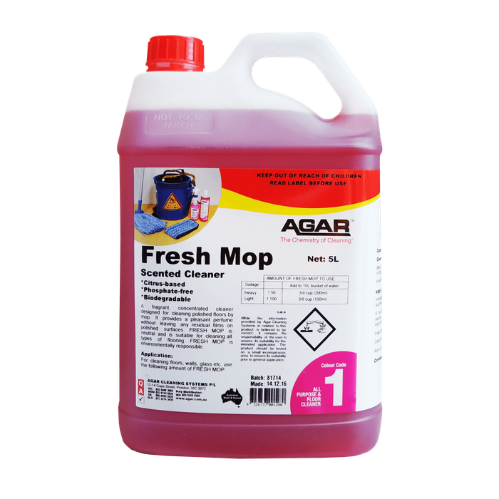 FRESH MOP is a lemon-scented mildly alkaline cleaner that will remove fats, oils, dirt, spillages, vehicular road dirt, floor traffic, soilage, and spills of all kinds.