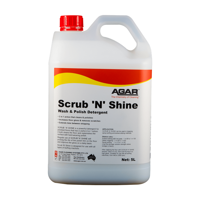 SCRUB ‘N’ SHINE is a powerful detergent for polished floors that has a useful 2 in 1 action: it both cleans the floor and replenishes the surface with hard-wearing polish.