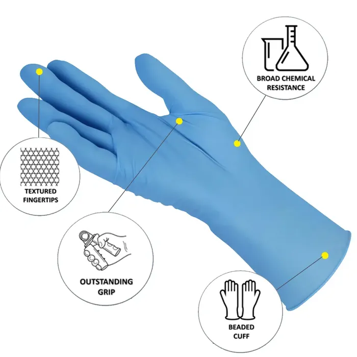 Nitrile Blues PF are strong and durable with excellent grip and offer outstanding chemical resistance, particularly with petroleum-based chemicals.