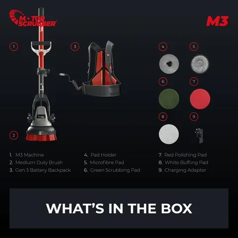 Starter Kit Includes: Motorhead complete with hub, backpack harness, 12-volt battery, battery charger, telescopic handle, medium-duty brush, pad holder, green scrubbing pad, red cleaning pad, white buffing pad, and microfibre pad