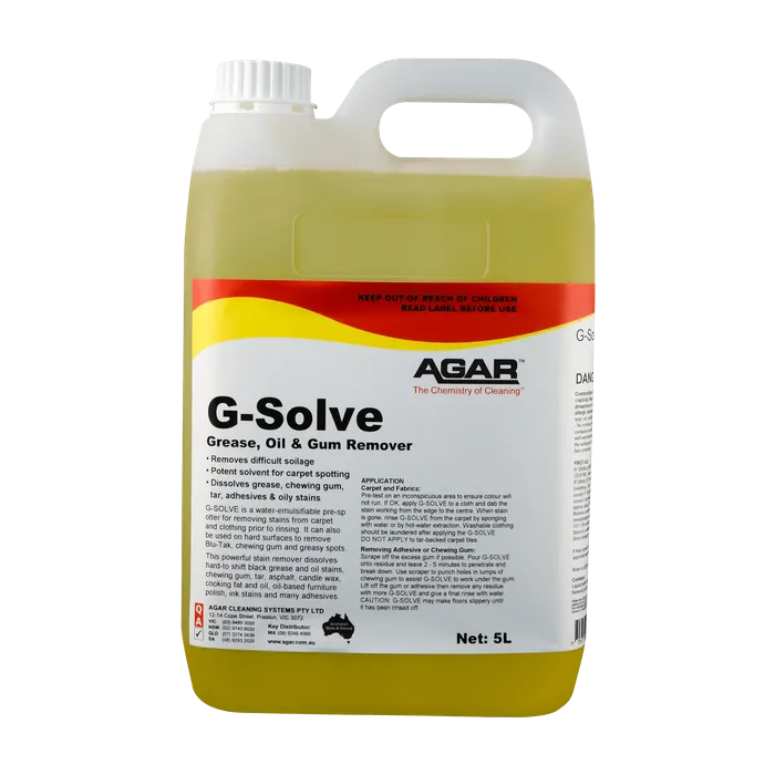- G-SOLVE will dissolve grease, chewing gum, tar, adhesives and oily stains.