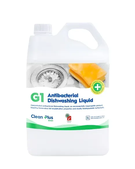 G1 – Antibacterial Dishwashing Liquid is a concentrated antibacterial dishwashing liquid. It combines rapid cleaning of all common food soils, excellent stable suds, and tremendous fat emulsification properties. The most important aspect is its safety and soft feel on the skin due to its superior emollient properties. G1 effectively cleans all types of wares, removing the toughest soils. The unique detergent blend promotes sparkling clean results and does not make wares slippery to handle. It features a concentrated biodegradable formula, is free rinsing and mild on hands.